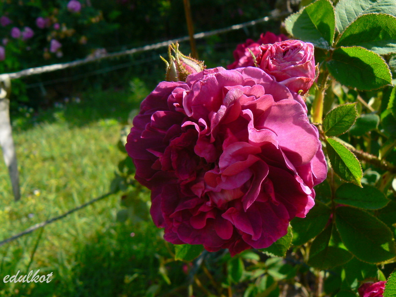 Kwiaty karmazynowe, purpurowe o rozetowej budowie, duże, podwójne, pączki jak i pędy mocno omszone