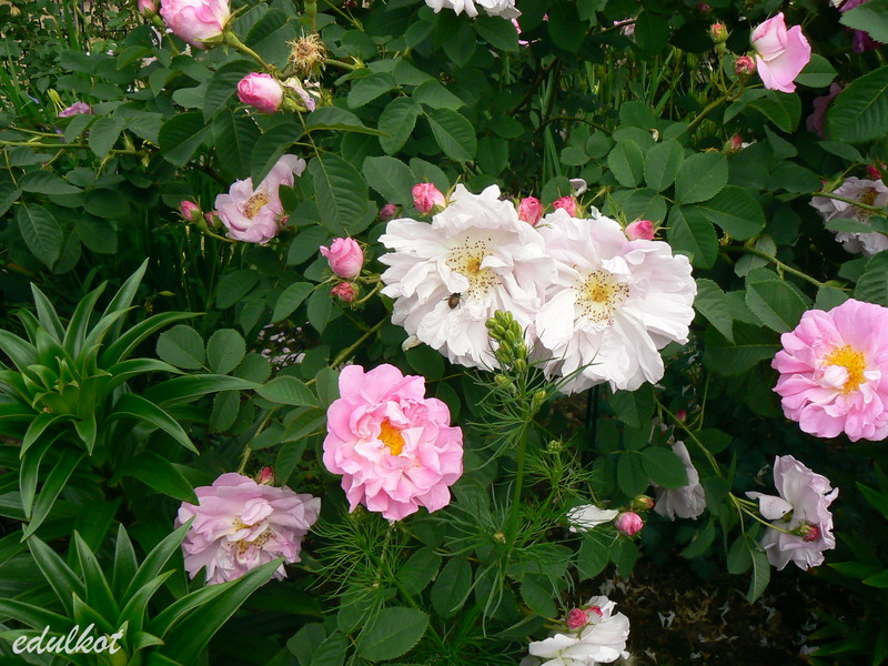 Kwiaty: różowe do białego w rozkwicie, średnie ok. 7 cm, półpełne (9-16 płatków), ze złotymi pręcikami, kwitnie raz.