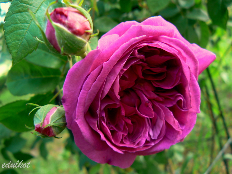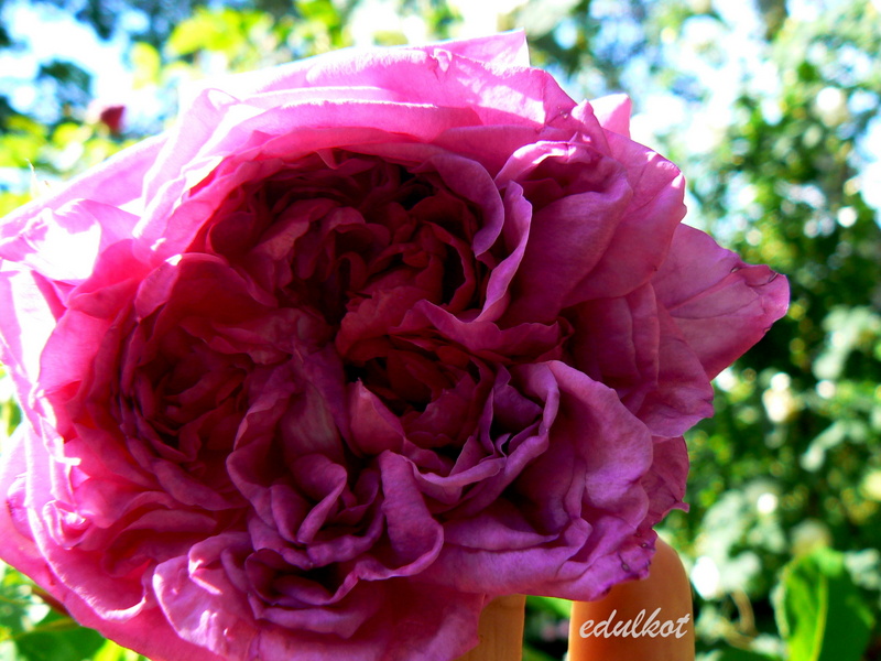 Kwiaty: purpurowo-czerwone pełne (41+ płatków), o rozetowej budowie, kwitnie tylko raz,