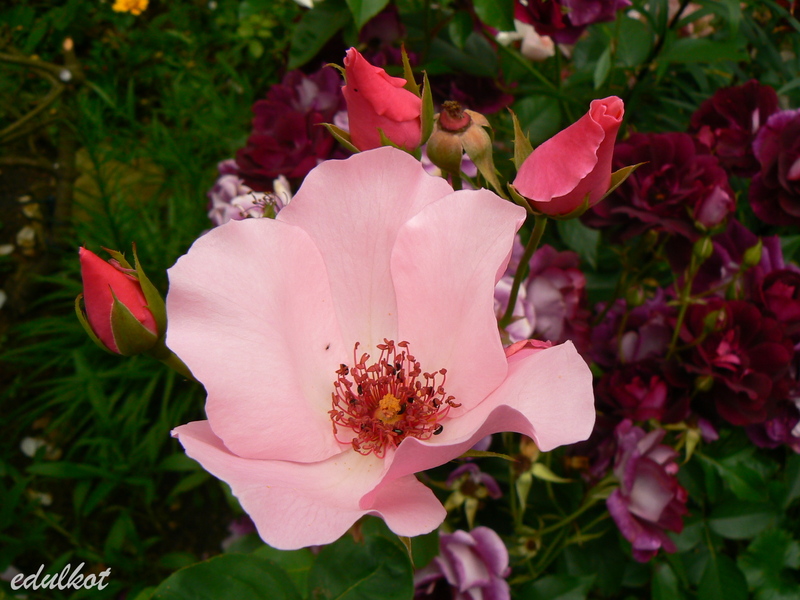 Kwiaty: różowołososiowe, średnie, ok. 9 cm, pojedyncze (4-8 płatków), płaskie, odsłaniają pylniki w rdzawoczerwonym kolorze, powtarza kwitnienie,