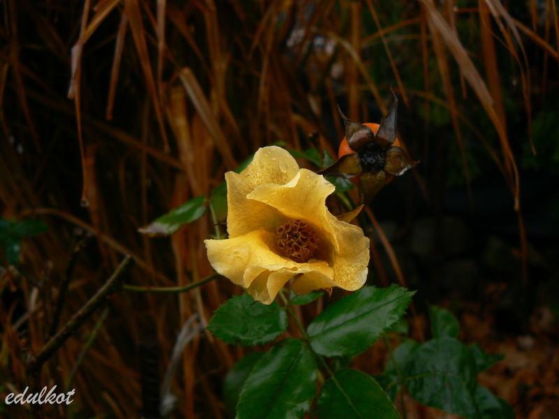 całkiem brzydkie zdjęcie ale pokazuje późnojesienny kwiatek razem z owocem, owoców ma ciągle dużo, muszę zrobić im zdjęcia