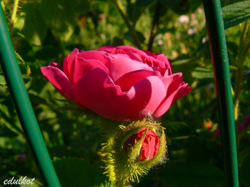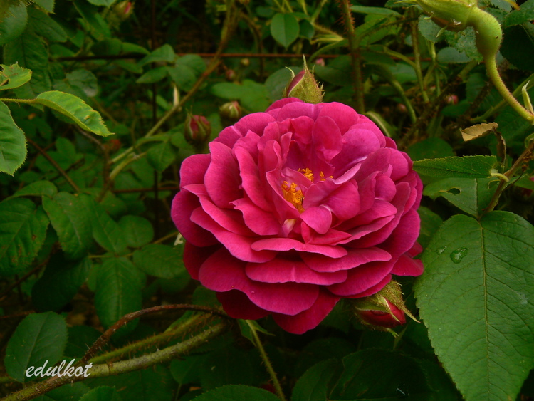 Kwiaty: średnie ok. 6-7,5 cm, półpełne, ciemno różowe poprzez liliowe do czerwonych, w rozkwicie pokazuje żółte pręciki, pąki okryte zielonym mchem, kwitnie raz choć podobno czasami powtarza, zawiązuje owoce,