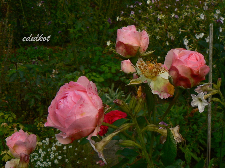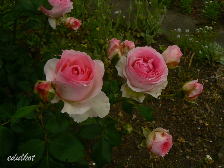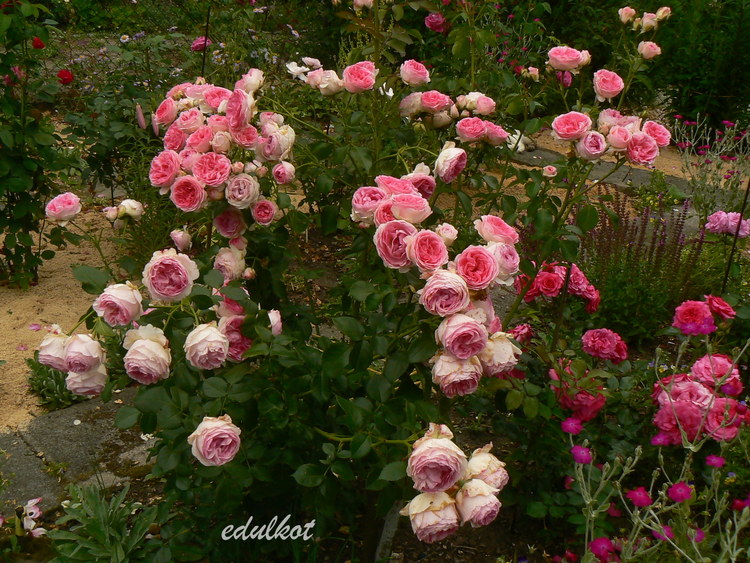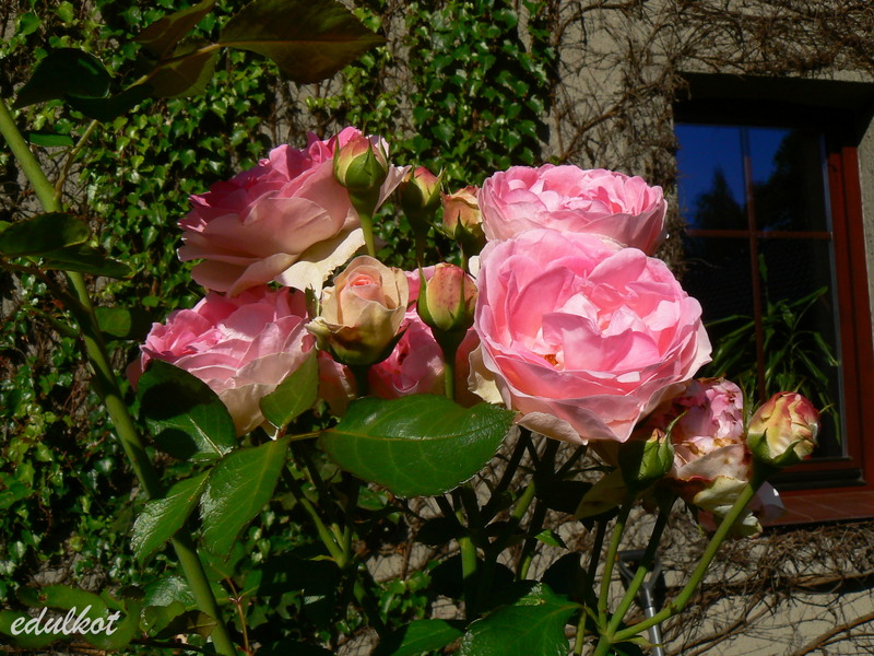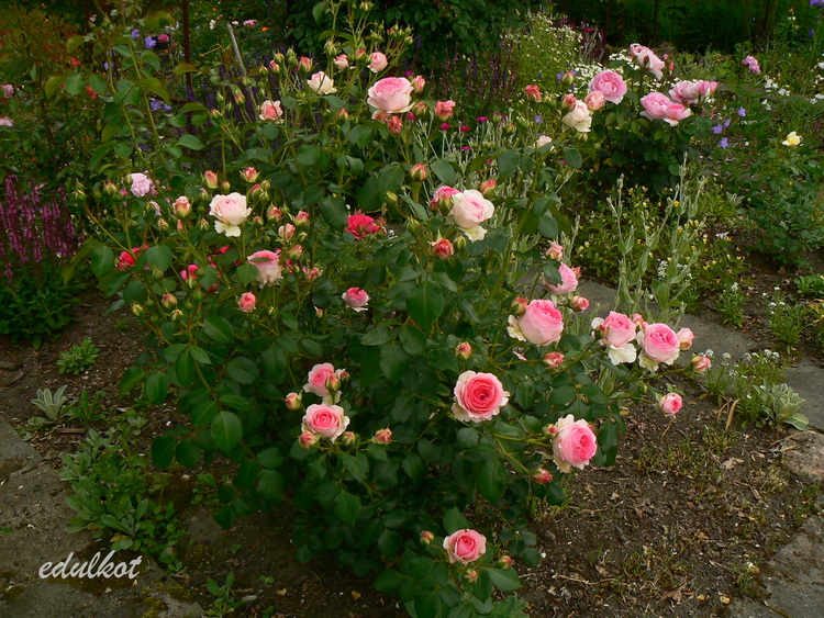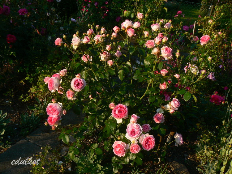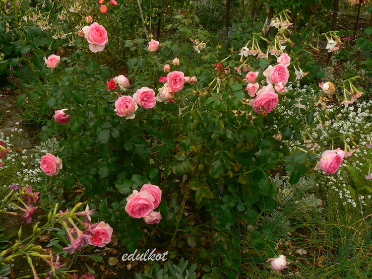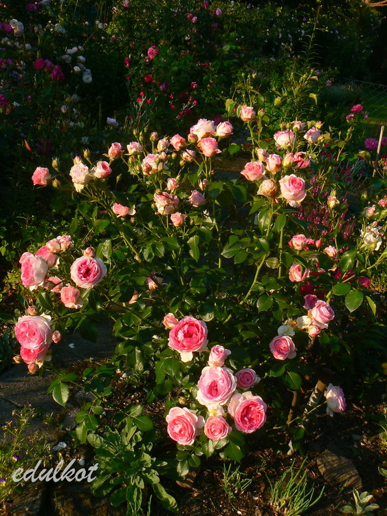 Kwiaty: różowe do jasnoróżowych, średnie, pełne (ponad 40 płatków), kwitnie bukietami cały sezon,