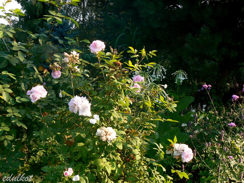 Kwiaty: jasno-różowe jaśniejące do białego w miarę rozkwitania, średnie ok. 5-6 cm, półpełne (26-40 płatków), kwitnie cały sezon aż do mrozów, w czasie deszczowej pogody pąki mumifikują się i trzeba obrywać te mumie,