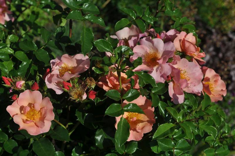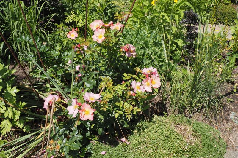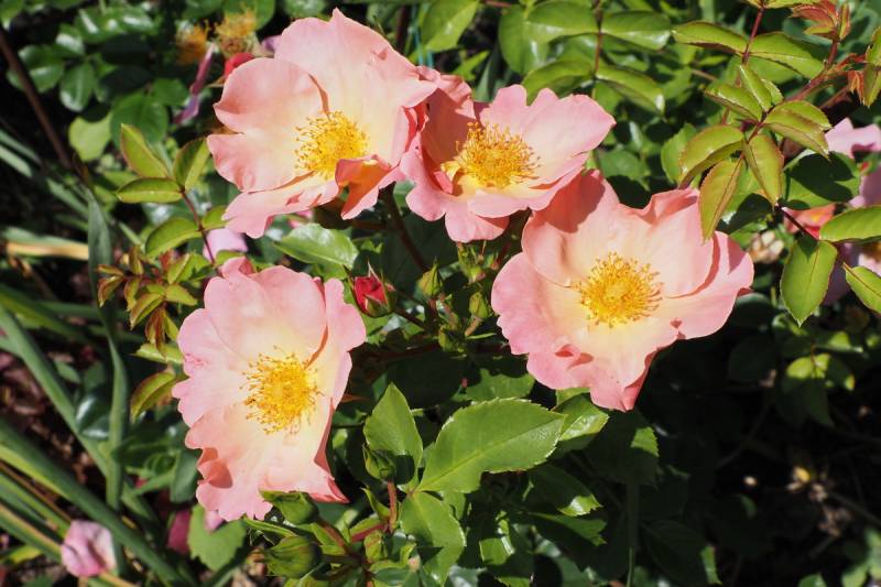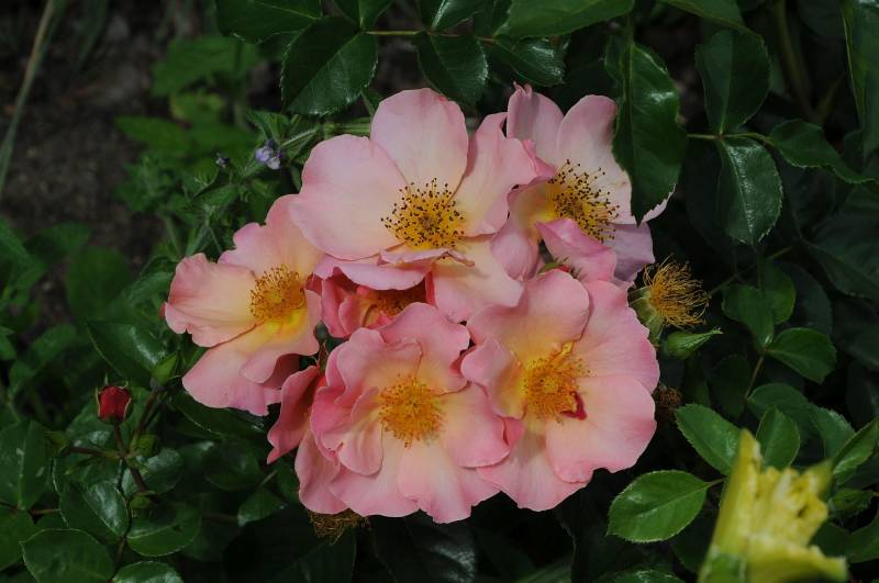 Urocza róża, z tych, co to ‘ładnie trzepoczą rzęsami’. Pylniki w żółtym kolorze zwabiają owady, widać to na zdjęciach.