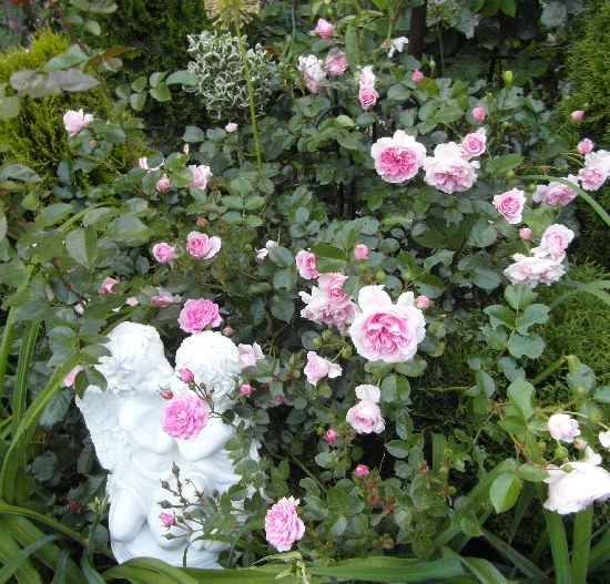 Kwiaty: różowe, średnie ok. 6-8 cm, bardzo pełne (75-85 płatków), rozetowe, staromodne, kwitnie bukietami cały sezon, delikatne płatki brzydko wyglądają podczas deszczu,