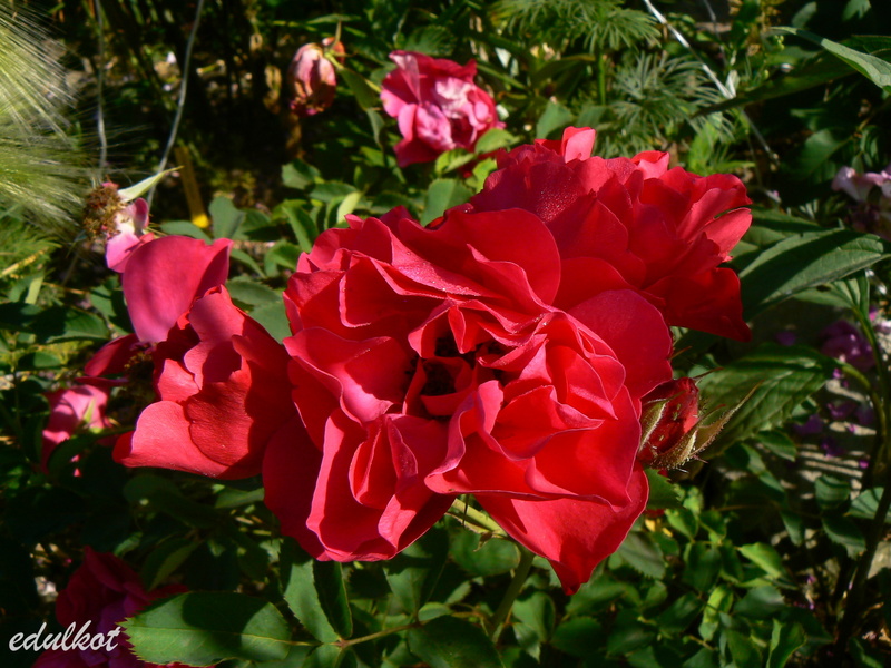 Kwiaty: karminowo-różowe, średnie ok. 6-7 cm, pojedyncze i półpełne (16-25 płatków), kwitnie bukiecikami całe lato, sporadycznie powtarza,