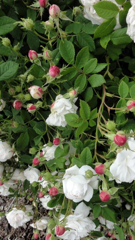 Kwiaty pąki malinowe, kwiaty białe, średnie, bardzo pełne, kwitnie raz