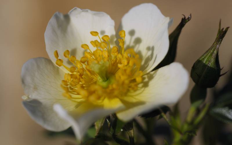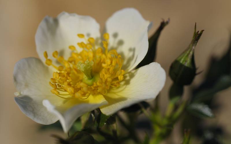 Kwiaty: małe 3 cm, pięciopłatkowe, białe, żółte pręciki, kwitnie bukiecikami cały sezon;