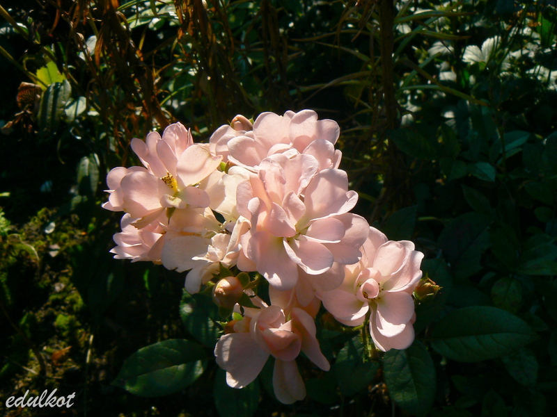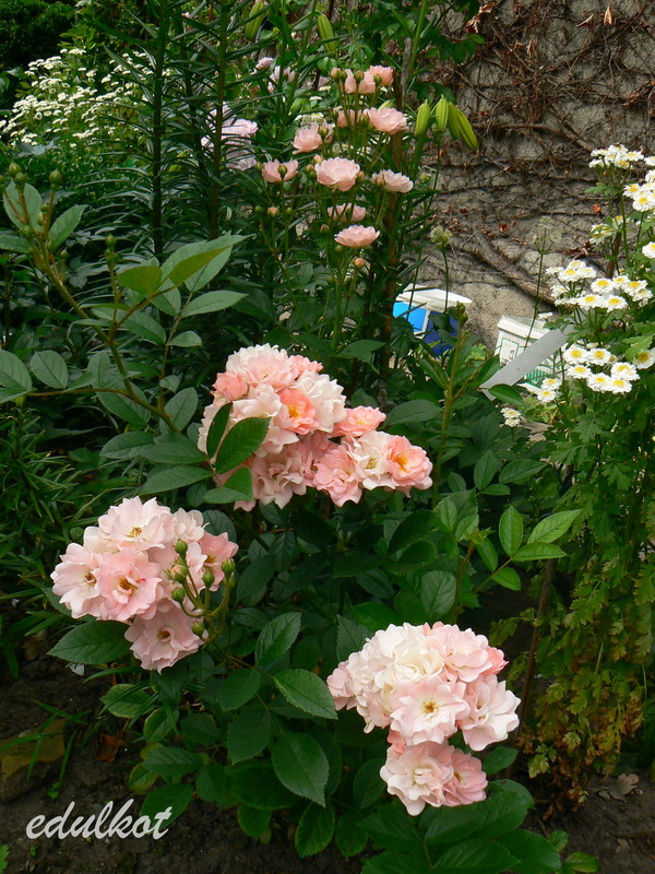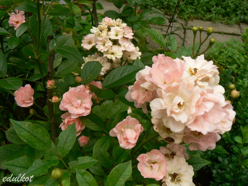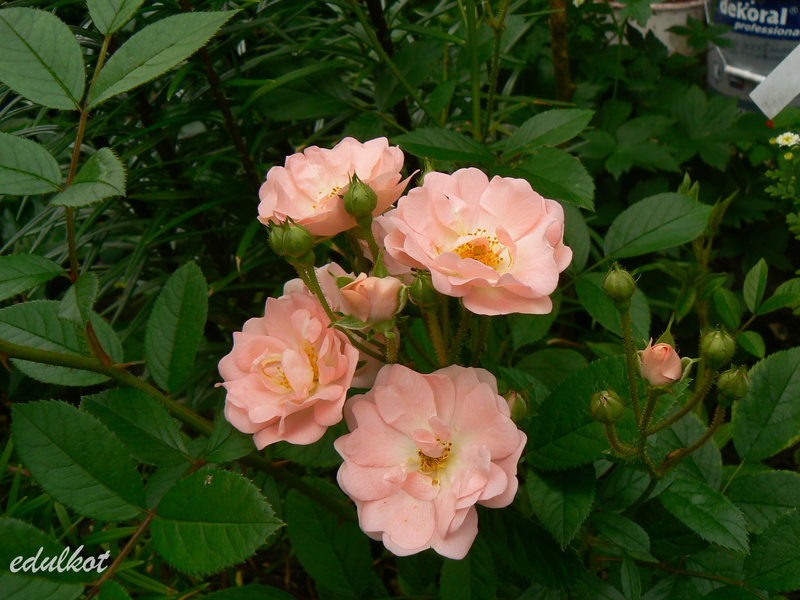 Kwiaty: małe 3-5 cm, półpełne (16-25 płatków), miseczkowate, różowo-pomarańczowo-łososiowe do białego, zebrane po kilkanaście na końcach pędów na kształt pomponików, powtarza kwitnienie;