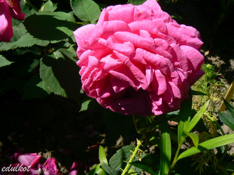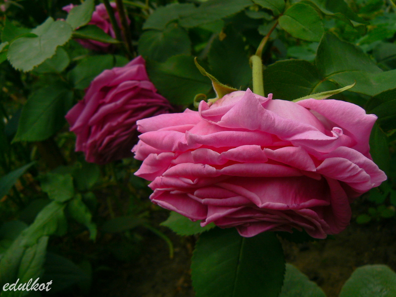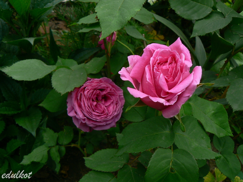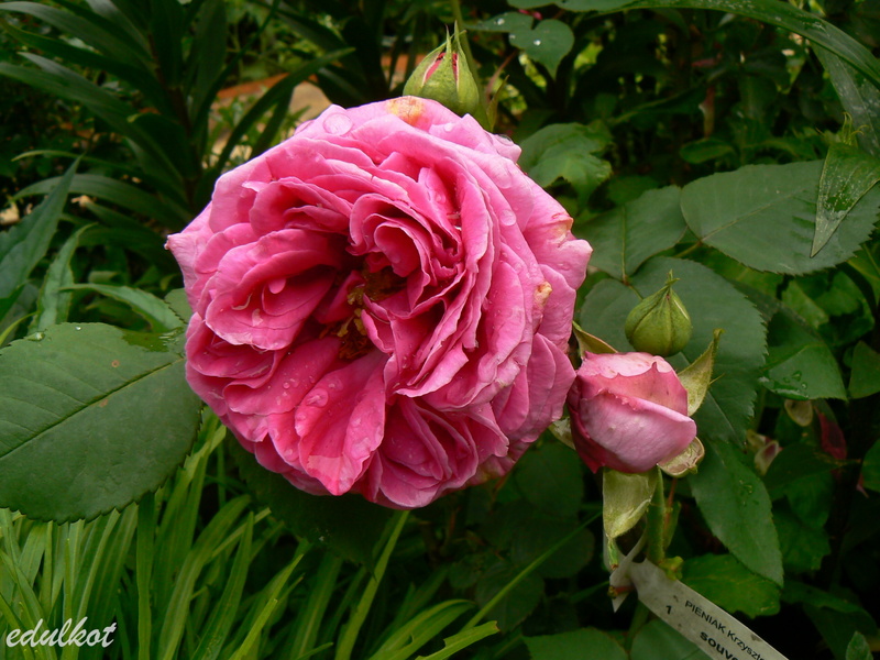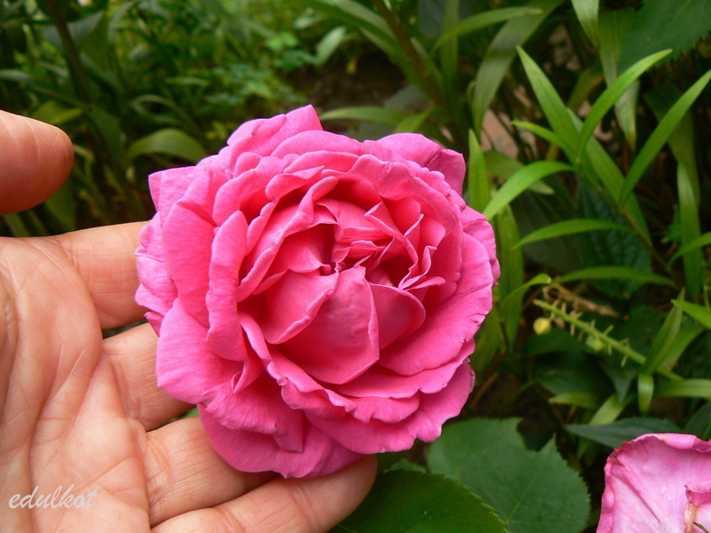 Kwiaty: duże, pełne, ćwierć-rozetowe, czerwono-różowe, purpurowe cieniowania, powtarza kwitnienie;