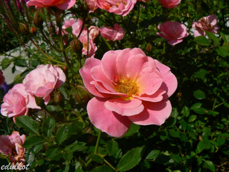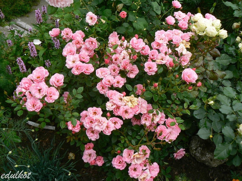 Kwiaty: małe 3-4 cm, półpełne (9-16 płatków), różowe, kwitnie cały sezon, kwiaty same odpadają po przekwitnięciu;