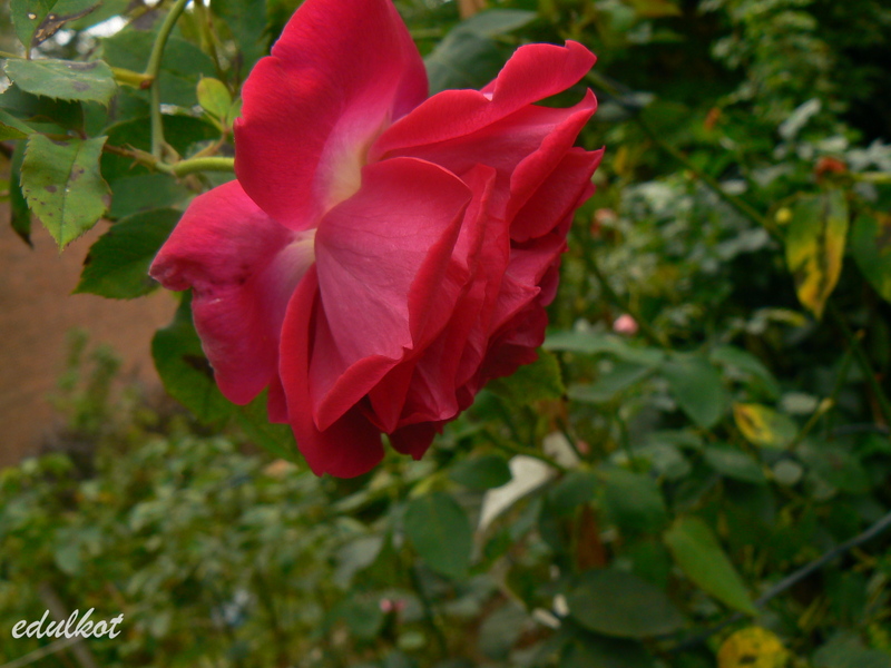 Kwiaty: duże 9 cm, pełne (26-40 płatków), rozetowe, czerwone, powtarza;