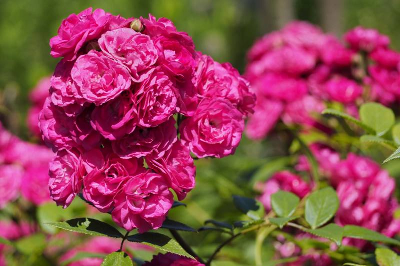 Róża zdrowa, liście błyszczące, ciemnozielone. Pędy gęsto pokryte drobnymi kolcami, łukowato pokładają się na boki pod ciężarem kwiatostanów.