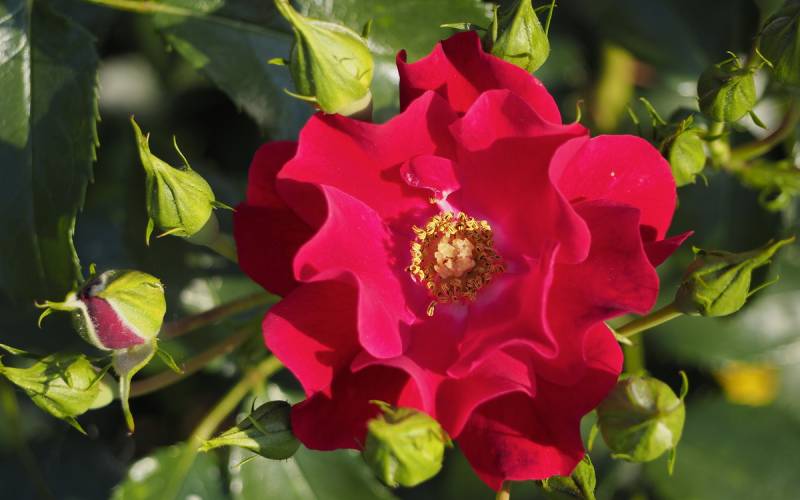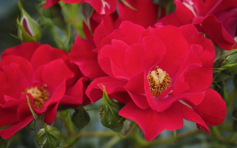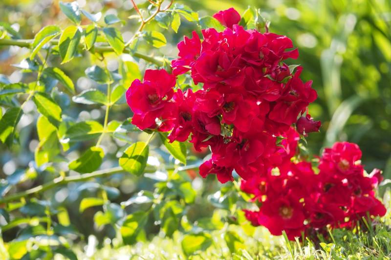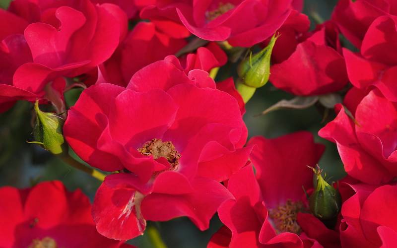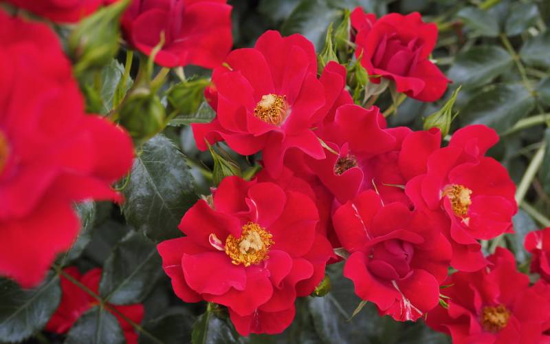 Kwiaty: krwisto-czerwone, podwójne (Ø 3 – 4 cm), licznie zebrane w kwiatostanach; często powtarza kwitnienie
