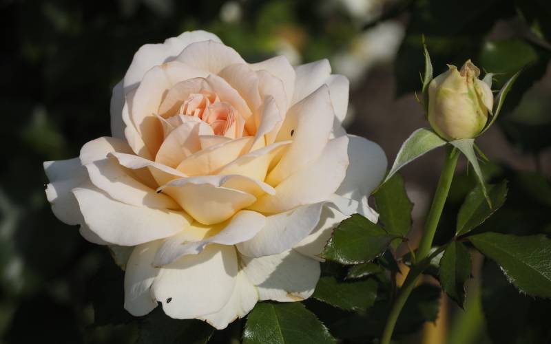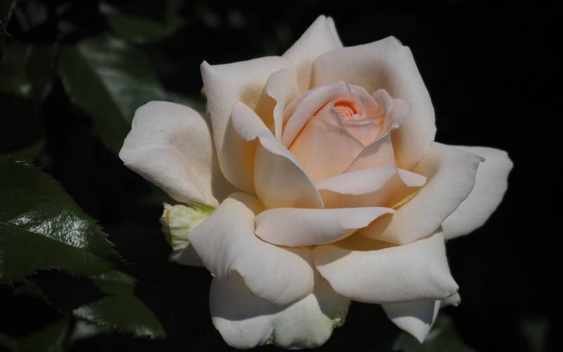 Kwiat: kremowy z różowym rumieńcem o szlachetnym kształcie ( Ø: 8 -10 cm ) złożony z ponad 50 płatków
