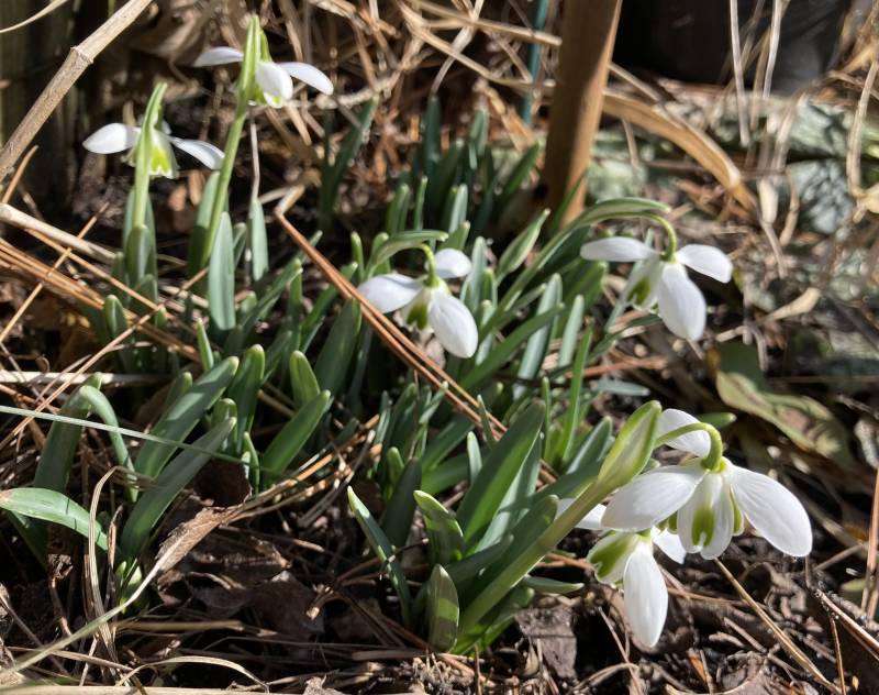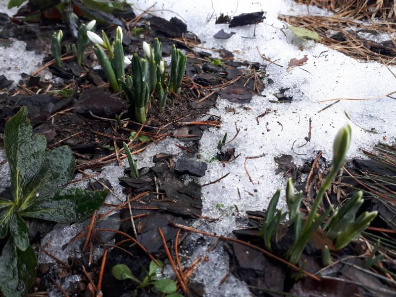 Powoli pokazują kwiaty odmianowe śnieżyczki Elwesa, ale nie sprawdziłam odmian. Nivaliski są jakby mniej wyrywne, choć coś tam się już wyłania.