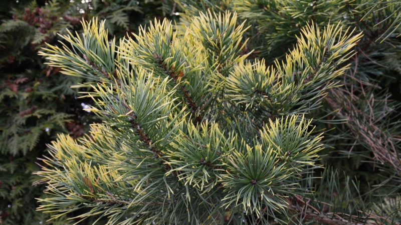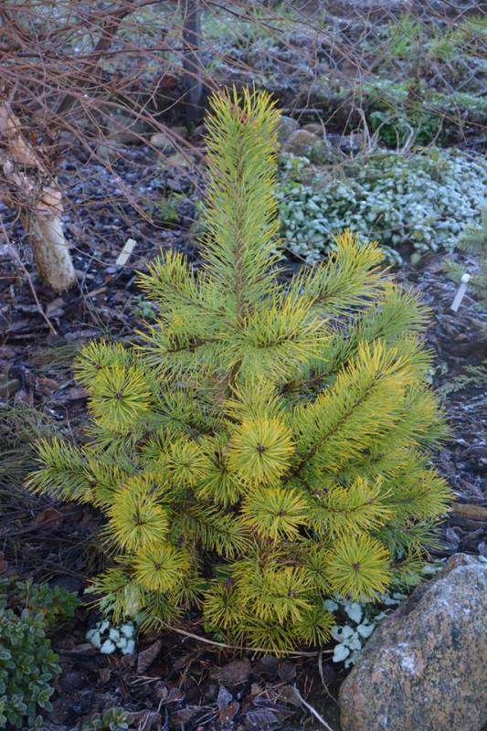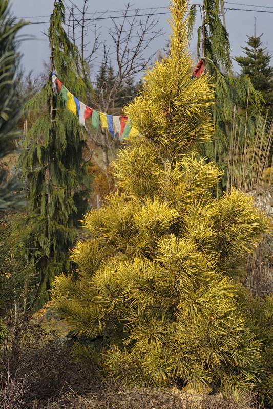 Sosna o pięknym złoto-żółtym kolorze w zimie, także wiosną i latem w kolorze jasnej cytrynowej zieleni.