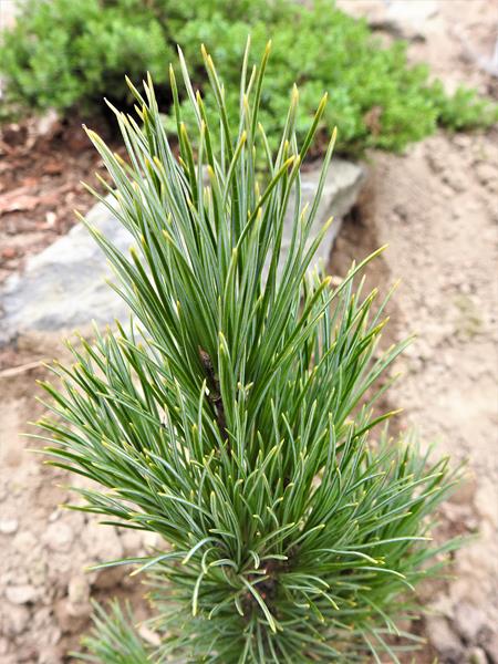 Sztywne, żywozielone i ostro zakończone igły zebrane są w pęczki po 5 na krótkopędach. Osiągają 7–9 cm długości i 1 mm szerokości, na przekroju są trójkątne, na brzegach delikatnie ząbkowane. Pochewki liściowe szybko opadają.