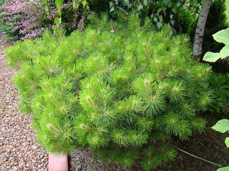 Sosna gęstokwiatowa 'Jane Kluis' od pięciu lat rośnie u mnie na przepuszczalnym, lekko ocienionym stanowisku. W tej chwili ma niecałe 0,5 m. wysokości i ok.1 m. średnicy. U tej odmiany podoba mi się kolor igieł, taki soczysto zielony, wręcz wiosenny przez cały sezon.