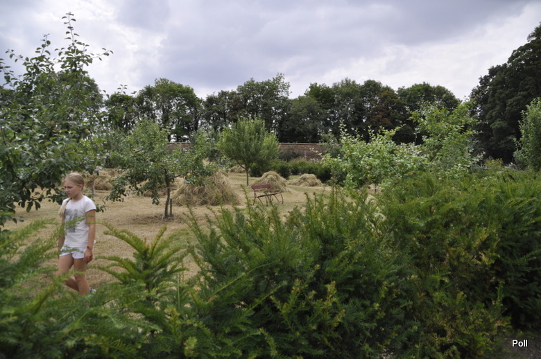 [1] Angielski ogród kuchenny otoczony murem z rabatami ozdobnymi oraz ziołowymi przy pałacu na Warmii, Polska.