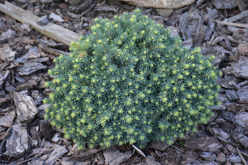 Rośnie w lekko spłaszczoną kulkę odznaczając się zielono-niebieską barwą igieł. Po 10 latach osiągnie wymiary 30x40 cm.
