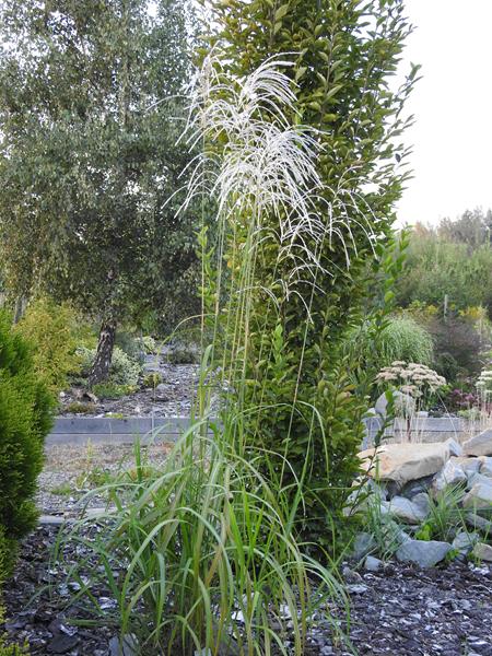 drugi z kwitnieniem zameldował się miskant Roter Pfeil - rośnie u podnóża skalniaka