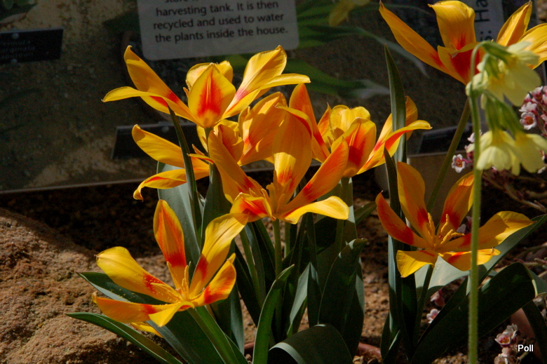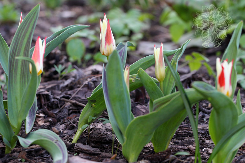 Tulipa fosteriana) - osiągają 30–40 cm, kwiaty ognistoczerwone, charakterystycznie rozwarte w drugiej fazie kwitnienia, liście z wąską brunatną obwódką. Kwitną na początku kwietnia.