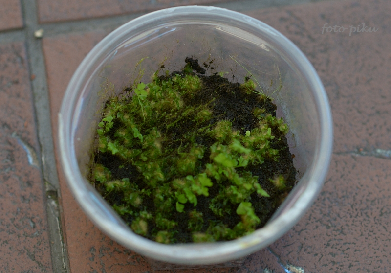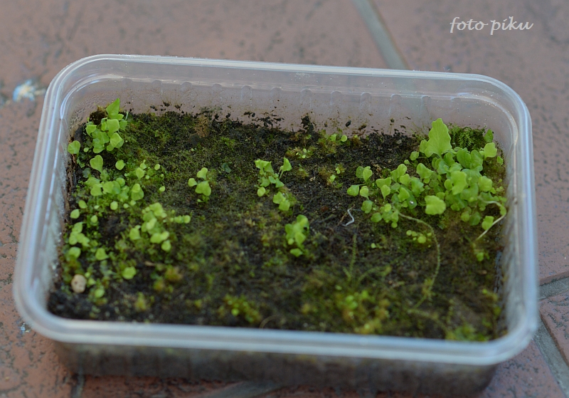 Równo po roku, w lutym 2018 r. zauważyłam malutkie listeczki na niteczkowatych łodyżkach, wiosną przestawiałam pojemnik na wschodnie okno nad kaloryferem, miało być jaśniej i cieplej, a w efekcie przesuszyłam. Wyniosłam pojemnik wiosną na zewnątrz w celu unicestwienia, ale dałam jeszcze szansę, przełożyłam to co zostało do nowego pojemnika, niższego, obsypałam przesianym kompostem, podlałam i postawiłam na zewnętrznym parapecie bez dostępu bezpośredniego słońca. Kiedy tam zajrzałam po pewnym czasie