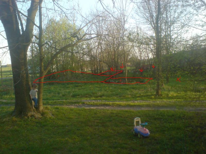 Na zdjęciu poniżej (stan z 27.04.2012r) zaznaczyłam ruinki i rozsączenie oczyszczalni a strzałkami leszczyny i jesion (nie widać go bo inny go zasłania). Reszta krzaczorów obecnie już nie istnieje (no może z wyjątkiem tego krzaka na rogu ruinki nr 2 poniżej strzałki pierwszej z lewej, wiem nakłądają się na siebie). Dodatkowo krzyżykiem początek rabaty, którą widać na zdjęciu z poprzedniego posta. Może w czymś pomoże....