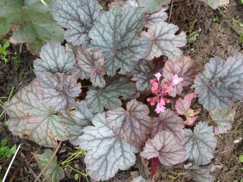 Rodzaj:Żurawka (Heuchera) Odmiana: 'Milan' Wymiary : odmiana tworząca kępy o szerokości 40cm i wysokości 25 cm. Kolorystyka: liście fioletowe ze srebrnym połyskiem Kwiaty: różowe od maja do września Warunki: stanowisko pół-cieniste/słoneczne.