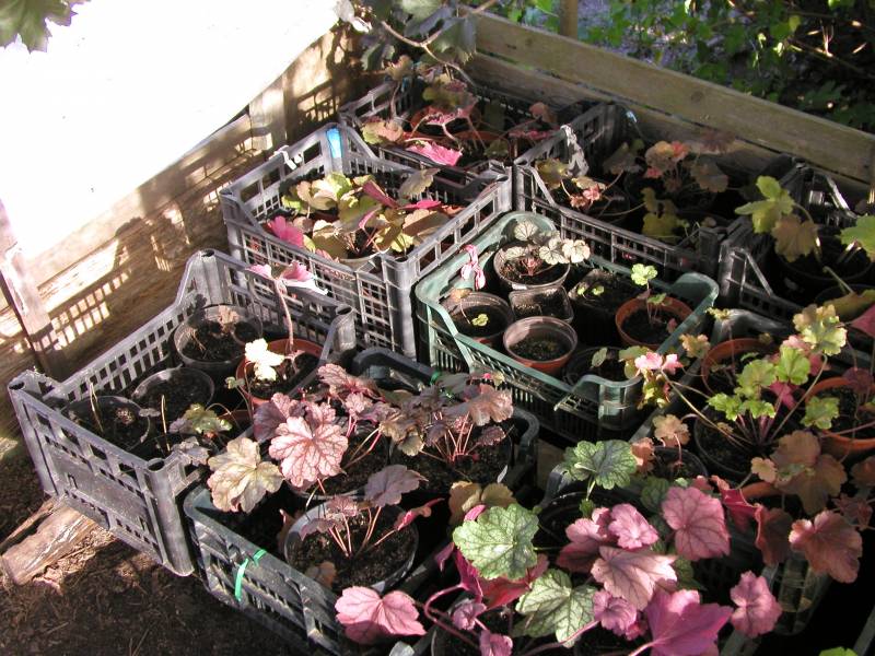 Skrzynki z ukorzeniającymi się żurawkami, tutaj mają dość ciemno. Jest ponad 60 doniczek. Sadzonki robione w trzech terminach: od 3 maja do 1 lipca b.r.