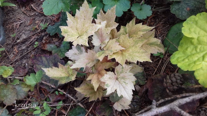 Chocolate Ruffles - wygląda spod hortensji, którą nazywam "Chełmska", ponieważ tam jest b. popularna i stamtąd ze mną przyjechała.