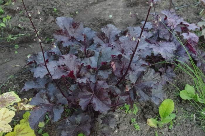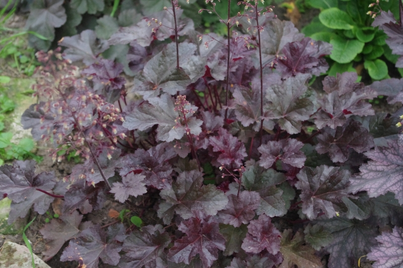 Rodzaj: Żurawka (Heuchera) Odmiana: Licorice Wymiary : odmiana tworząca kępy o szerokości 40 cm i wysokości 30 cm/60 cm z kwiatostanem. Kolorystyka: liście ciemne, błyszczące z nieregularnym, srebrnymi plamami . Kwitnienie: białymi kwiatami od maja do lipca Warunki uprawy: stanowisko pół-cieniste/słoneczne, gleba próchniczna, żyzna, stale lekko wilgotna .