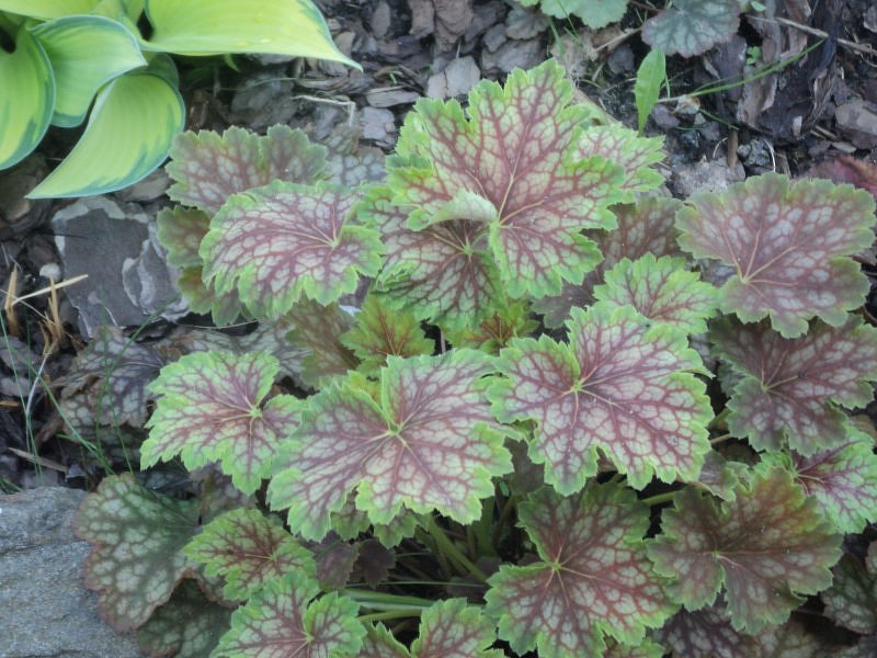 Rodzaj: Żurawka (Heuchera) Odmiana: Mercury Wymiary : odmiana tworząca kępy o szerokości 45 cm i wysokości 30 cm/80 cm z kwiatostanem. Kolorystyka: kwiaty kremowo-zielone, liście zielone z purpurowym żyłkowaniem i srebrnym marmurkiem. Kwitnienie: od maja do sierpnia. Warunki: stanowisko pół-cieniste/słoneczne .