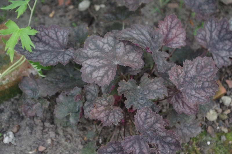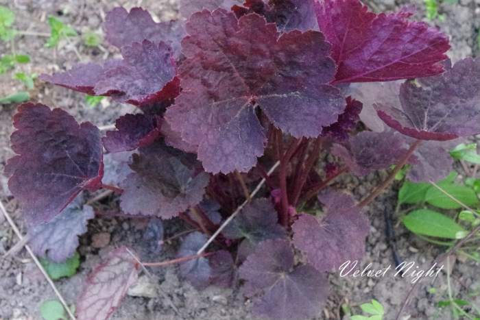 Rodzaj: Żurawka (Heuchera) Odmiana: Velvet Night Wymiary : odmiana tworząca kępy o szerokości 40 cm i wysokości 30 cm/60 cm z kwiatostanem. Kolorystyka: liście fioletowe ze srebrnym marmurkiem. Spód liścia purpurowy. Kwiaty: białe. Kwitnienie: od maja do lipca. Warunki: stanowisko pół-cieniste/słoneczne.