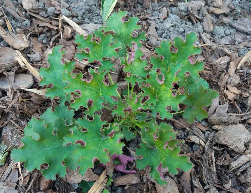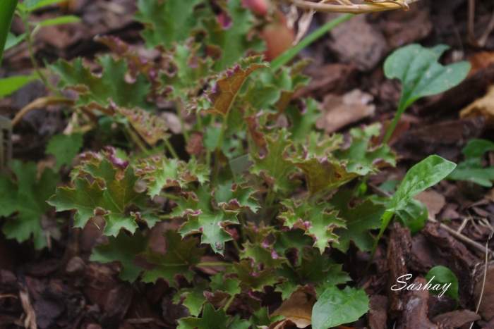 Dla mnie odmiana niezniszczalna, rośnie w każdych warunkach, i na każdym stanowisku. Liście mocno postrzępione i powcinane, z wierzchu intensywnie zielone a od spodu ciemno różowe. Kwiaty biało-beżowe. Dość szybko przyrasta osiąga ok 25-30 cm wysokości