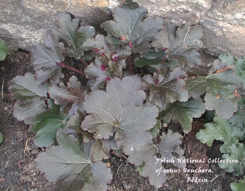 Rodzaj: Żurawka (Heuchera) Odmiana: Afra Wymiary: tworzy kępy o średnicy 35 cm i wysokości 25 cm/60 cm z kwiatostanem. Kolorystyka: młode liście purpurowe, starsze zielone z odcieniem purpurowym . Kwiaty: białe. Kwitnienie: od lipca. Warunki: stanowisko pół-cieniste/słoneczne.