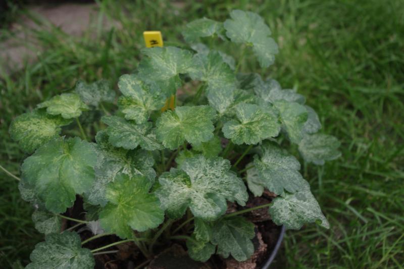 Rodzaj: Żurawka (Heuchera) Odmiana: Hercules Wymiary : odmiana tworząca kępy o szerokości 40 cm i wysokości 30 cm. Kolorystyka: ubarwienie mozaikowe typu variegata . Kwiaty: czerwone. Kwitnienie: od czerwca do lipca. Warunki: stanowisko pół-cieniste/słoneczne.