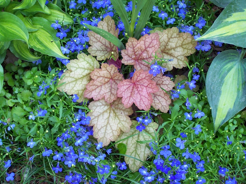 Rodzaj: Żurawka (Heuchera) Odmiana: Vulcano Wymiary: tworzy kępy o szerokości 30 cm i wysokości 20 cm Kolorystyka: liście w różnych odcieniach bursztynu z ciemniejszymi żyłkami Kwiaty: jasno różowe Kwitnienie: od czerwca do sierpnia Warunki: stanowisko od półcienia do słońca,