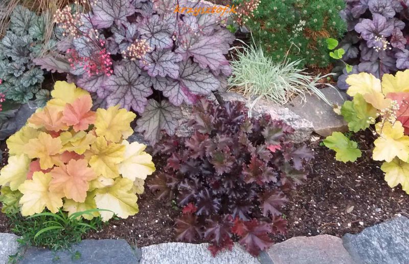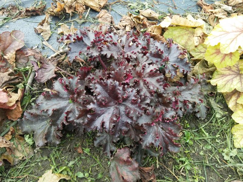 U mnie z racji tego że rośnie na pólcienistym stanowisku liście raczej ciemno-purpurowe a nie czarne, duże, pofałdowane, karbowane. Dorasta do 30 cm wysokości i 40 cm szerokości. Rośnie zdrowo, dość szybko przyrasta.