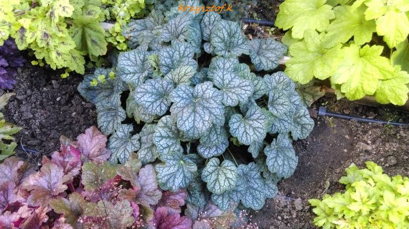 Rodzaj: Żurawka (Heuchera) Odmiana: Green Spice Wymiary : tworzy kępy o szerokości 40 cm i wysokości 25 cm . Kolorystyka: białe kwiaty. Liście metaliczne z mocno zaakcentowanym,szczególnie wiosna, zielonym marginesem z mocno kontrastowym, czerwonym unerwieniem . Warunki: stanowisko cieniste/pół-cieniste/na słonecznym wymaga wilgotniejszej gleby. Kwitnienie:maj/czerwiec.