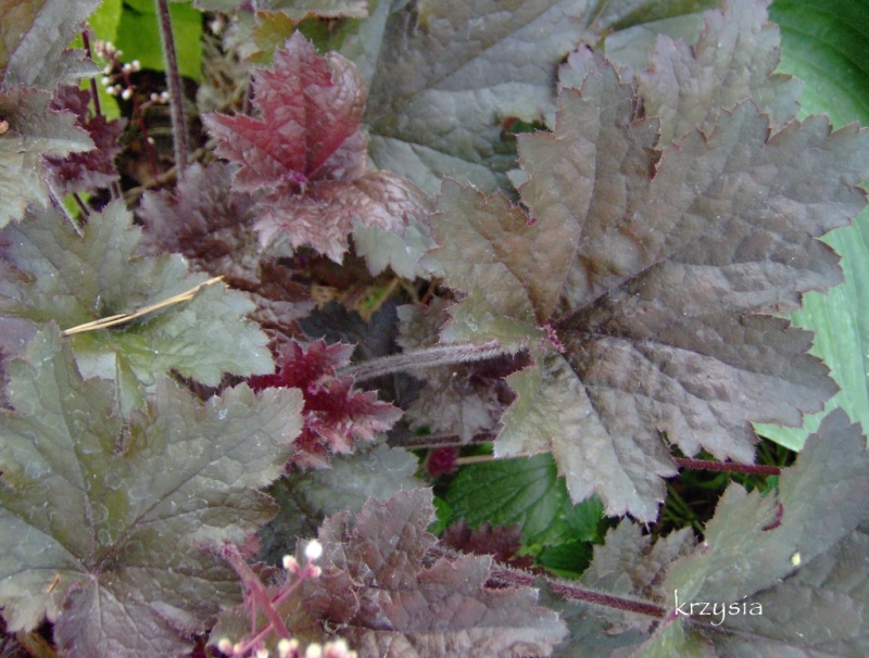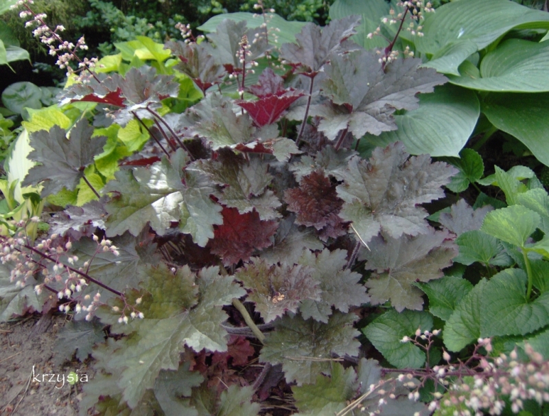 Rodzaj: Żurawka (Heuchera). Odmiana: Angelika. Wymiary: kępy o szerokości 35 cm i wysokości 25 cm. Kolorystyka: kremowe dekoracyjne kwiaty na ciemnych łodyżkach; duże, sercowate, pofalowane liście w kolorze zielonym i purpurowym. Warunki: stanowisko pół-cieniste/słoneczne. Kwitnienie: od czerwca.