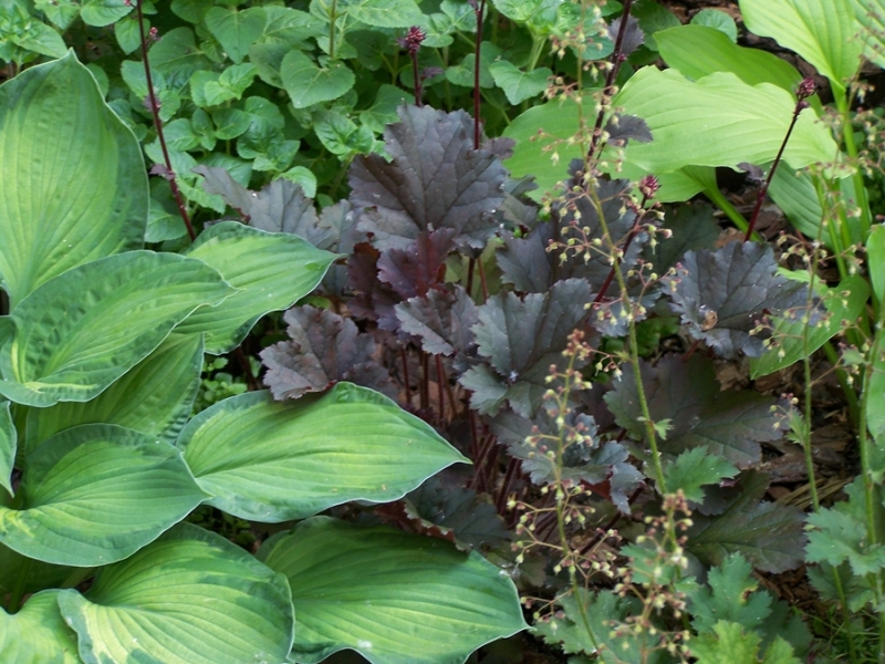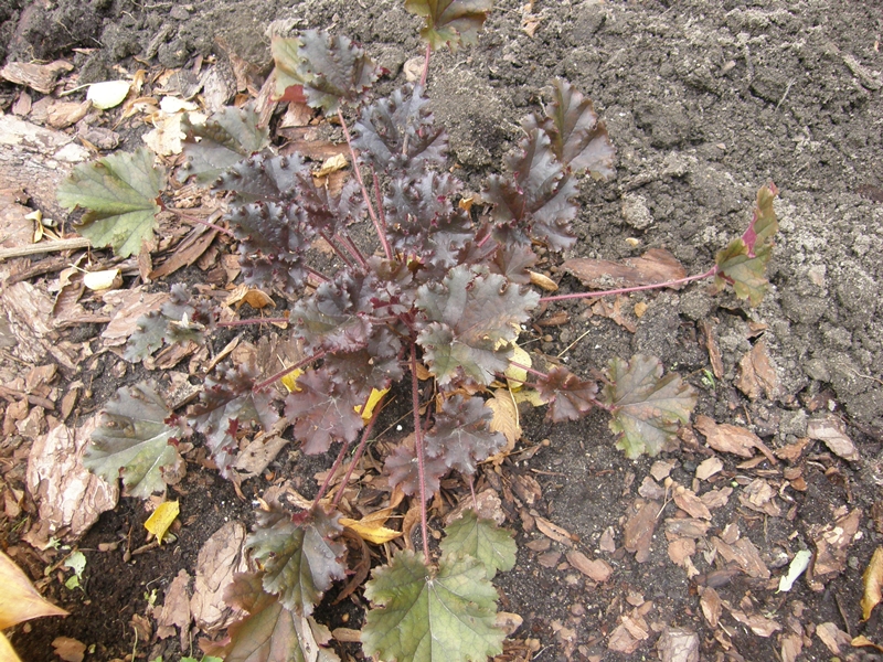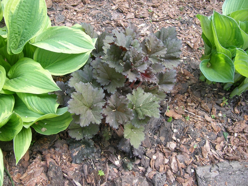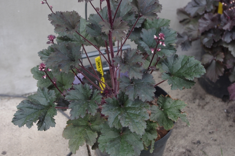 Rodzaj: Żurawka (Heuchera) Odmiana: Dark Secret Wymiary : odmiana tworząca kępy o szerokości 40 cm i wysokości 25 cm/70 cm z kwiatostanem. Kolorystyka: ciemno fioletowe, prawie czarne liście . Spód liścia purpurowy. Kwiaty:białe. Kwitnienie: od maja do sierpnia. Warunki: stanowisko słoneczne .