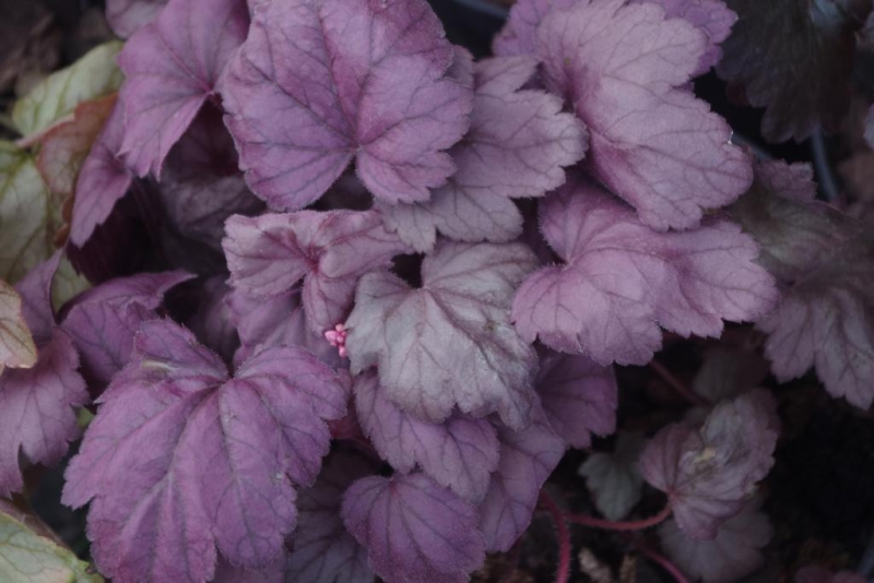 Rodzaj:Żurawka (Heuchera) Odmiana:'Grape Soda' Wymiary : odmiana tworząca kępy o szerokości 40 cm i wysokości 25 cm. Kolorystyka:kremowe kwiaty, różowofioletowe liście . Warunki: stanowisko pół-cieniste/cieniste , gleba żyzna, stale wilgotna. Kwitnienie: od kwietnia do sierpnia.