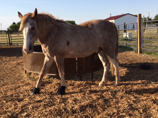 Zobaczy we wtorek, jak skoncze podawac leki. Dzis, z niechecia, ale jednak szedl na uwiazie. Mysle ze buty pomagaja, bo nie pomagaja amortyzowac ciezar. Dve przywiozl bele siana i Jerry jest z nia zamkniety w korralu.